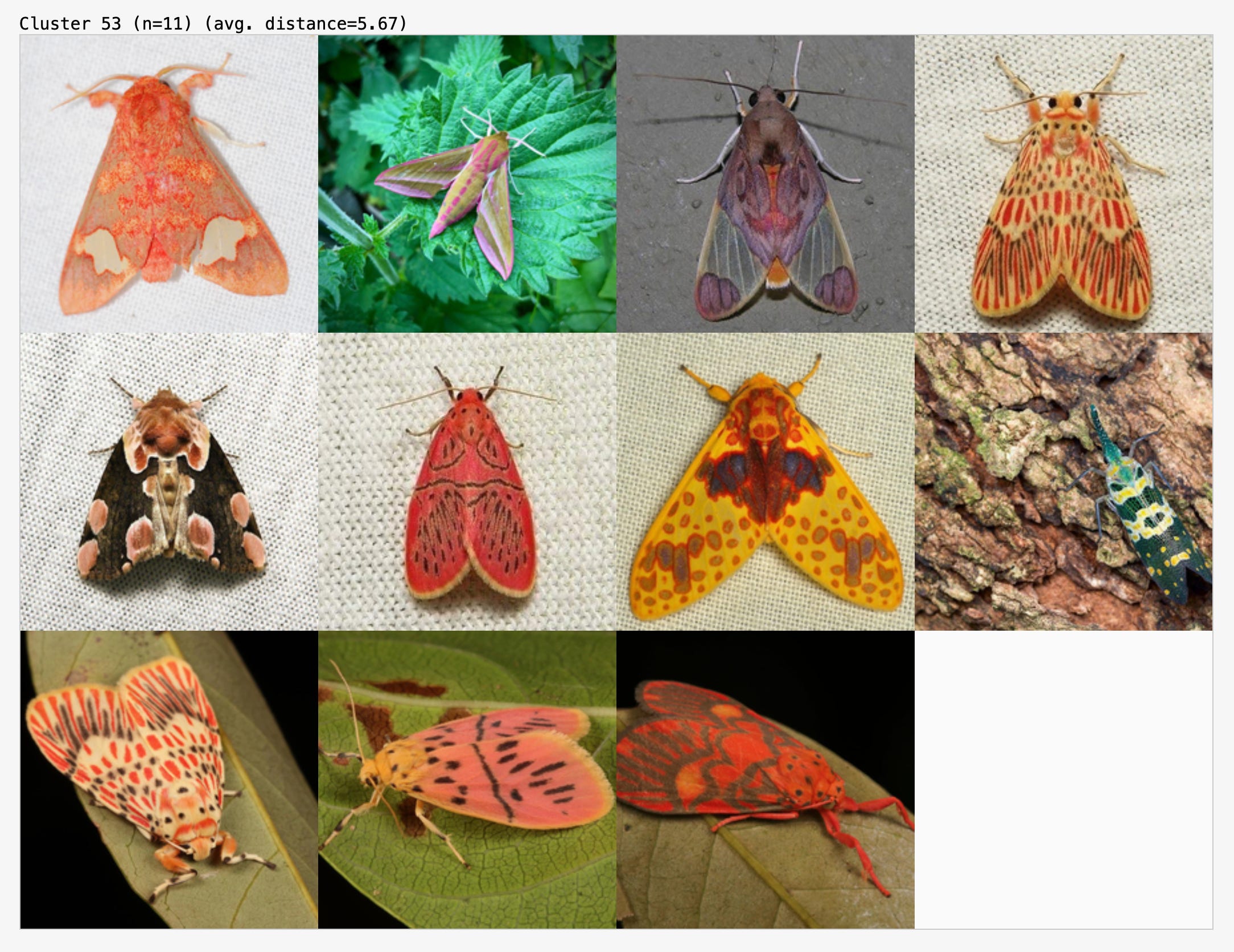 In this cluster, it correctly grouped images of orange and red moths: