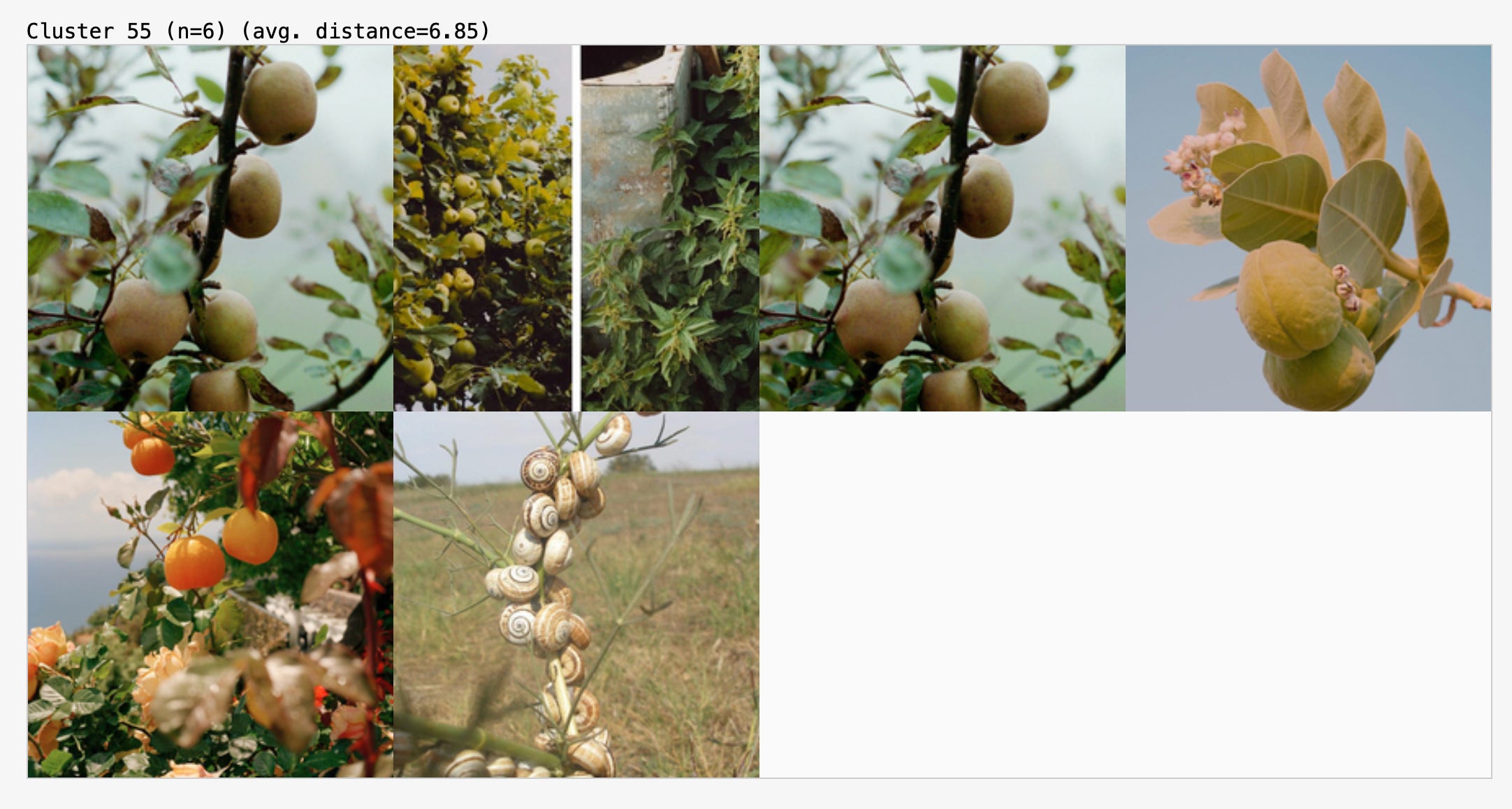 As noted above, the chosen channel leaves little room for interpretation. It’s interesting to see how visually the algorithm approaches its task here, grouping the snail shells together with the fruits on stems.